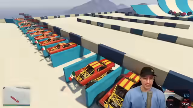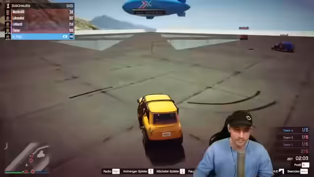 01:16:52Der Stream beginnt mit der Einladung von Spielern wie Ahmed Schachbrett und Schredder für eine Runde des Spiemodus 'Countdown'. Nachdem genug Teilnehmer vorhanden sind, startet das Spiel. Es handelt sich um ein Rennen, in dem Spieler Boxen erreichen müssen, die im Laufe des Rennens immer weniger werden. Dies führt dazu, dass immer mehr Teilnehmer ausscheiden, bis am Ende noch einer übrig ist. Die Runde startet mit einer Aufnahme.