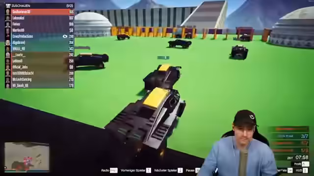 01:28:50Es werden technische Aspekte des Spiels und der Kameraeinstellungen besprochen. Der Streamer weist darauf hin, wie man die Kamera auf Fahrzeughöhe einstellt, um eine bessere Übersicht zu haben. Anschließend wechselt der Streamer zum Spielmodus 'Team Deathmatch' mit zwei Runden. Trotz der Teamzugehörigkeit kommt es zu häufigen Vorfällen, in denen Teammitglieder sich gegenseitig rammen und ausschalten, was den Streamer frustriert.