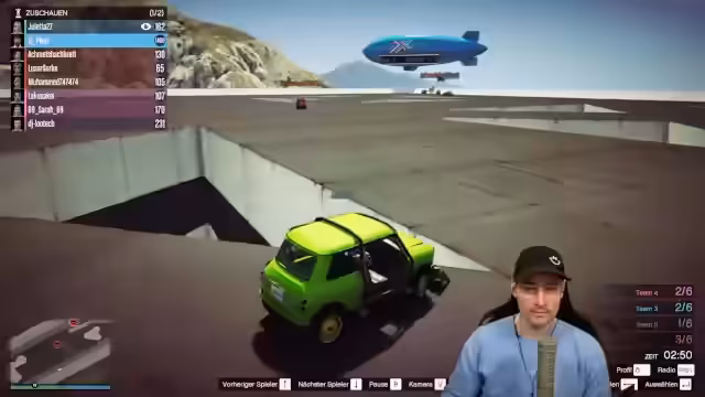 02:36:27Nach dem Sumo-Kampf wird der Spielmodus "Bad Basketball" eingeführt. Der Streamer und seine Mitspielen sind zunächst verwirrt über die ungewöhnlichen Regeln und den Ziel des Spiels. Es werden Koffer eingesammelt, doch das Ziel ist unklar. Nachdem der Modus als "scheiße" bezeichnet wird, wird schnell ein neuer Modus gestartet: Plane vs. Sanchez. Hierbei fliegen Teams in Flugzeugen, um Motorradfahrer von Plattformen zu stoßen, oder die Spieler versuchen, mit Motorrädern durch eine Strecke zu kommen. Die Runde endet jedoch nach einer kurzen Zeit, als der Streamer gegen einen Baum fliegt.