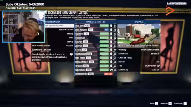 01:28:09Ein spontanes Community-Event im GTA im Face-to-Face-Modus wurde organisiert. Der Streamer betonte die Wichtigkeit der ersten zehn Sekunden für den Erfolg und verteilte über einen längeren Zeitraum Einladungen an die Zuschauer. Nach anfänglichen technischen Schwierigkeiten und dem Ausfall eines Spielers startete das Event schließlich mit 15 Spielern, bei dem es zu chaotischen Kämpfen mit unterschiedlichen Fahrzeugen kam.