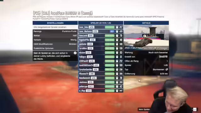 00:26:00Der Streamer startet eine 'Face-to-Face'-Rennmission in 'GTA Online'. Anfangs gibt es Probleme beim Einladen und beim Start der Session, hauptsächlich aufgrund von Serverproblemen von Rockstar Games. Nachdem die Mission endlich beginnt, wird intensiv und humorvoll getrollt. Es wird über die teils zufälligen und teils taktischen Fahrzeuge gesprochen, und der Streamer versucht, Deko während des Rennens zu provozieren und zu trollen.