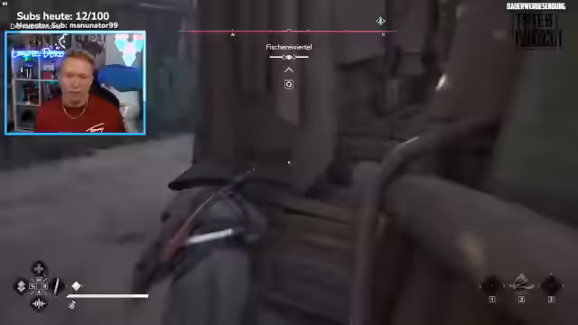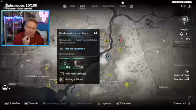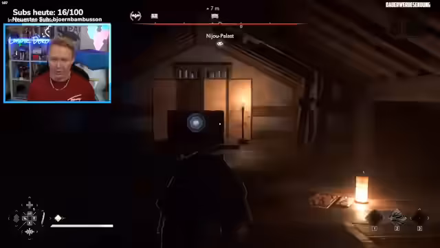 00:32:46Der Stream startet in Assassin's Creed: Shadows. Der Streamer spielt mit der Figur Naoe und ist auf der Mission, verschiedene Bandenchefs zu eliminieren. Er hat bereits einige Anführer ausgeschaltet und macht sich auf den Weg, um den Anführer der Kabukimono-Gruppierung zu jagen. Er erklärt die Mechanik des Spähers, der zum Aufdecken von Gebieten und zum Schmuggeln von Ressourcen in das Versteck genutzt wird.