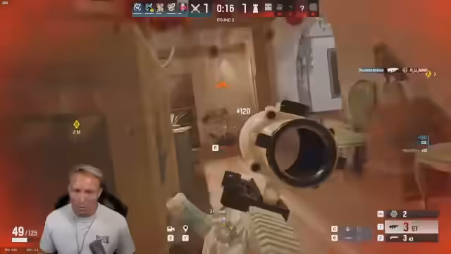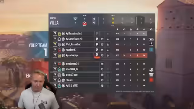 04:34:25Der Stream startet mit einer Session von Rainbow Six Siege. Es werden Operator-Optionen wie Sledge und Osa diskutiert, mit dem Plan, Sledge im Office-Bereich zu nutzen. Dabei kommt es zu einer frühen Präfierung durch Ash, was für Irritation sorgt. Der Ping von 317 wird als problematisch erwähnt. Die erste Runde endet mit einem klaren Verlust, da Teamkämpfe verloren wurden und es zu unglücklichen Bewegungen wie dem Hängenbleiben an Kanten kam.