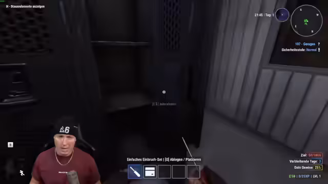 00:43:06Nach ersten missglückten Einsätzen plant das Team strategisch: Sie besprechen den Kauf von Erste-Hilfe-Kits und speziellen Einbruchswerkzeugen. Ein Fokus liegt auf dem Knacken von Safes mittels Stethoskop und das Umgehen von Überwachungskameras, wobei Steine als Abwehrmöglichkeit entdeckt werden. Schwierigkeiten bereiten die komplexen Schlösser und die präsenzder Polizei. Die Runde wird von tödlichen Begegnungen und spektakulären Fluchtversuchen geprägt, während das Team versucht, die nötige Summe durch Diebstähle zu erreichen und dabei ständig neue Spielmechaniken wie das Heilen mit Medkits erforscht.
