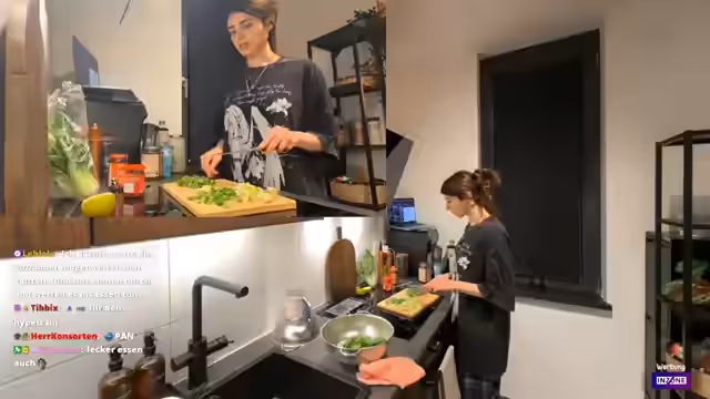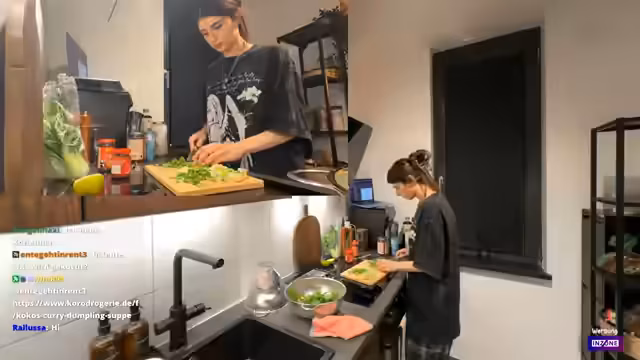 00:43:17Trotz der technischen Probleme beginnt der Streamer mit der Zubereitung der Kokos-Curry-Dumpling-Suppe. Er startet mit dem Schneiden der Frühlingszwiebeln und des Knoblauchs, wobei er zuerst bei der Zwiebelzubereitung Schwierigkeiten hat, aber dann eine schnelle Technik findet. Während der Zubereitung unterhält er sich mit dem Chat über verschiedene Themen, darunter die Bedeutung persischer Wörter für Zwiebeln und Frühlingszwiebeln. Er erwähnt auch seine Allergien gegen Staub und Histamin. Der Streamer zeigt sich bei der Ingwerzubereitung etwas überfordert und fragt den Chat um Ratschläge, wie man Ingwer schält und reibt. Während des Kochprozesses gibt er wichtige Tipps, wie das Händewaschen und das Vermeiden von technischen Ablenkungen.