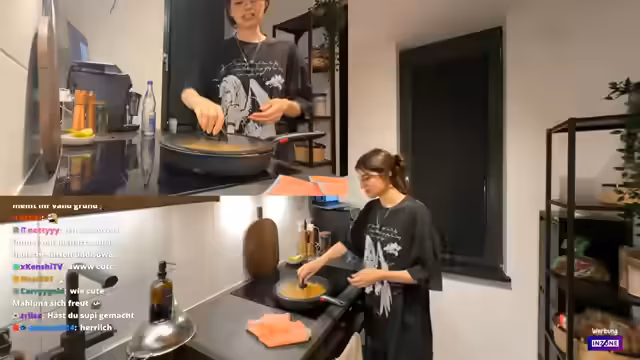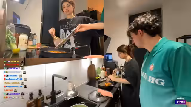 01:55:36Während des Streams äußert der Streamer Symptome einer Erkältung, von der er behauptet, diese kaum zu spüren, da er sich mit Medikamenten vollpumpt. Die Currypaste wird in Kokosmilch abgelöscht, wobei er ständig technische Probleme wie das Stoßen der Pfanne und Verbrühungsgefahren schildert. Gleichzeitig erwähnt er sein positives Verhältnis zum Produkt Koro, für das er wirbt.