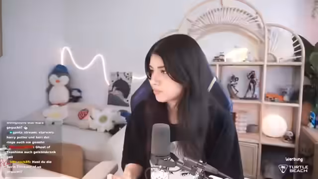 00:30:12Die Streamerin beschreibt technische Probleme mit der Belichtung der Kamera, da von draußen Licht hereinkommt. Sie liest weiter aus dem Chat und zeigt sich erfreut über die Unterstützung. Danach beginnt sie, Videos anzuschauen, um die Zeit bis zum Dark Souls 3 Event um 15 Uhr zu überbrücken. Sie geht auf verschiedene Themen wie das ESC-Finale, GTA 6 und persönliche Geschichten ein.