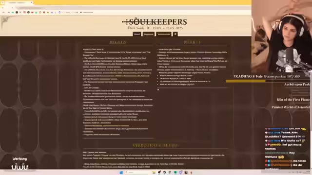 01:04:57Um 15 Uhr beginnt der eigentliche Dark Souls 3 Stream. Die Streamerin begrüßt ihr Publikum und teilt mit, dass sie nur vier Stunden geschlafen hat. Sie spricht über die Regeln für den Run und erwähnt, dass bisher nur bestimmte Waffen wie der Twinblains gebannt wurden. Mit ihrer Partnerin Divi plant sie, mit der Waffe Ward's Hammer zu spielen, die sie als sehr stark beschreibt, aber möglicherweise nicht erlaubt sein könnte. Sie beginnt mit dem Gameplay und zeigt verschiedene Techniken.