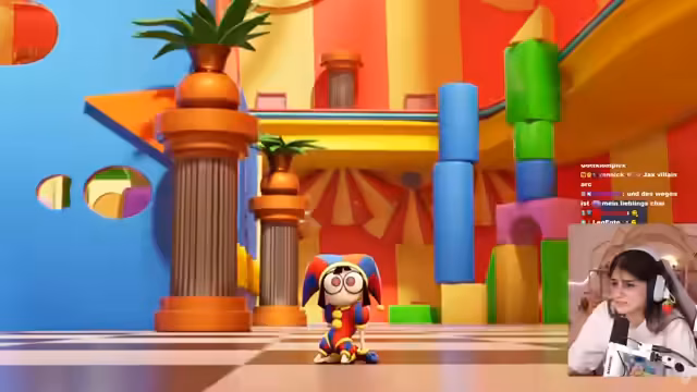 00:38:08Die Streamerin stellt die Animationsserie 'Digital Circus' des Kanals Glitch vor. Sie selbst hat die Serie durch TikTok entdeckt und ist süchtig danach geworden. Sie erläutert die Grundgeschichte: Pomni, die ihren Namen vergessen hat, landet in einem von Cain kontrollierten Zirkus und muss verhindern, dass sie und die anderen Charaktere ihren Verstand verlieren. Sie betont, dass die Serie zwar kindlich wirkt, aber in späteren Folgen sehr erwachsen und verrückt ist, und empfiehlt sie dem Chat.