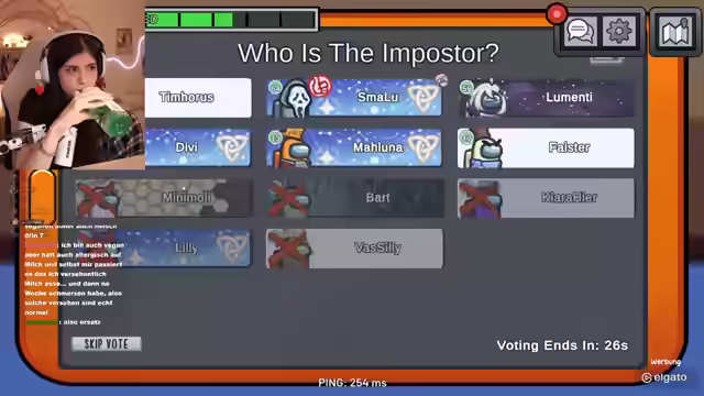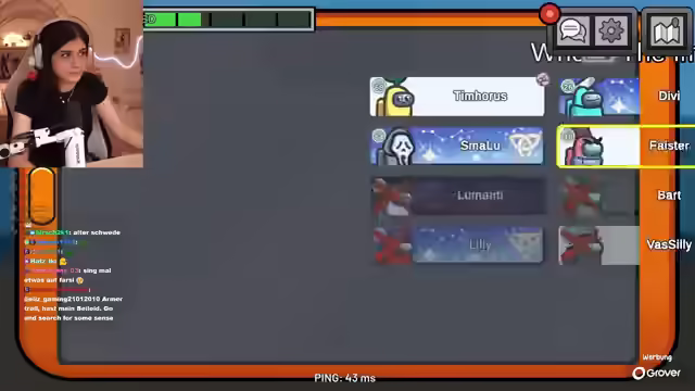 02:33:08Die Streamerin spricht über ihre Erfahrungen nach einer Party, bei der sie sich mit Covid infiziert hat, und erwähnt, dass sie jetzt wieder gesund ist, aber noch leichtes Halskratzen verspürt. Sie erinnert sich an den Glam-Bot auf der Party und bedauert, dass sie sich nicht getraut hat, ihn zu nutzen. Sie erzählt von ihren Erfahrungen auf Filmpremieren mit roten Teppichen und wie unangenehm sie diese Situationen fand. Im Chat wird nach einem Wehr-Command gefragt, und die Streamerin bittet Chris, sich darum zu kümmern. Sie entdeckt ein Hamilton-Outfit im Spiel und fragt, wo man die Kamera bei Among Us einstellen kann. Es wird festgestellt, dass sie möglicherweise bereits alle Gegenstände im Spiel besitzt, was zu Spekulationen führt, ob sie ein Among Us Partner ist. Die Streamerin äußert den Wunsch, in der bevorstehenden Runde nicht der Killer zu sein, und es werden Witze über mögliche Spielstrategien gemacht. Die Lobby startet in Kürze, und die Streamerin freut sich auf die Pre-Geburtstags-Runde mit den Zuschauern. Es wird diskutiert, ob Rollen im Spiel sein sollen, und die Streamerin deutet an, dass sie in der nächsten Runde den Engineer aktivieren wird. Sie erklärt die Fähigkeiten des Engineers und des Phantoms und äußert ihr Erstaunen darüber, dass Tim bald 29 Jahre alt wird.