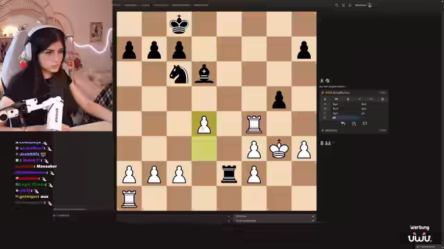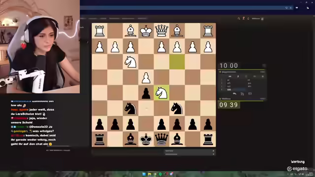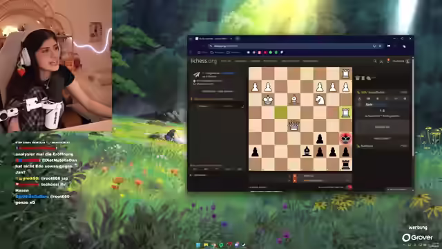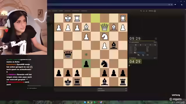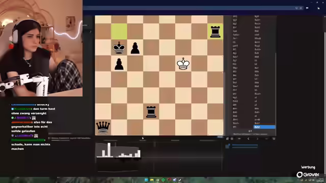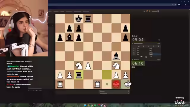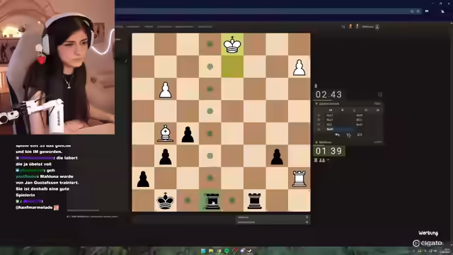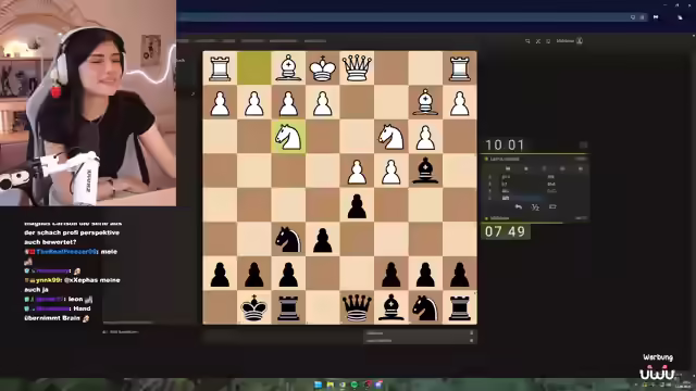 01:28:50Die Streamerin äußert ihre Abneigung gegen Sport, obwohl sie früher Basketball gespielt hat. Sie habe eine fragwürdige Ausdauer und sei unsportlich. Als Kind hat sie Kindertouren gemacht und geschwommen, sich dann aber auf Schach konzentriert. Tennis und Eishockey findet sie cool. Sie hatte mal den Traum, Bob zu fahren, aber es ist ihr zu teuer. Sie wäre gerne ein Profi im Klavierspielen gewesen, hat aber keine Lust, so viel zu lernen. Sie ist unmusikalisch und kann keine Noten lesen. Es wird über Stärken und Schwächen gesprochen, wobei Mathe und Musik bei der Streamerin problematisch waren. Es wird über eine Sportart gesprochen, die man schon immer lernen wollte. Die Streamerin wollte mit dem Läufer den Turm einkesseln. Sie hat Spaß an Schach, auch wenn sie nicht viel Theorie gelernt hat. Sie mag es, über Theorien nachzudenken, auch wenn sie meistens falsch sind. Es wird festgestellt, dass sie ein gutes Schachverständnis hat und sich an die normalen Schachregeln hält. Sie gibt zu, dass sie zu faul war, um sich mit den Figuren und ihren Positionen auseinanderzusetzen. Sie schaltet schnell auf Durchzug, was ihre größte Schwäche ist. Sie nimmt sich den Bauern.