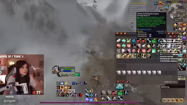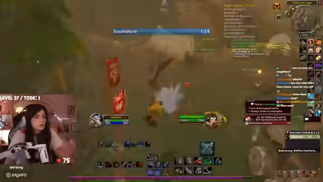 01:26:56Der Stream enthält Mitteilungen über das Schicksal anderer Spieler in der Hardcore-Community. So erfährt die Streamerin vom Tod von Spielern wie Parzi in der Dunkelküste und vom Ausstieg eines Teilnehmers aus privaten Gründen. Gleichzeitig berichtet sie von ihrem eigenen Fortschritt, wie dem Auffinden von Rüstungsteilen, dem Austausch von Gegenständen mit Spielern wie Dickus Bigus und dem Leveln in Feralas.