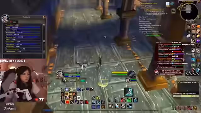 05:04:30Die Suche nach einer vollständigen Gruppe für den Scharlachroten Kloster-Run im Vorgebirge von Hillsbrad ist im Gange. Der Streamer sondiert im Chat, ob ein Spieler namens Kraft Interesse hat, mitzumachen. Nachdem dieser nicht reagiert, wird eine Gruppenkonfiguration mit Mage, Hunter, Priester, Krieger und einem optionalen Schurke anvisiert. Es gibt einen Disput über die notwendige Mindeststufe, wobei eine Stufe von 38 oder 39 als sicherer angesehen wird, da die Gegner im Kloster schwer sind.