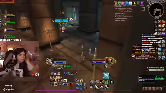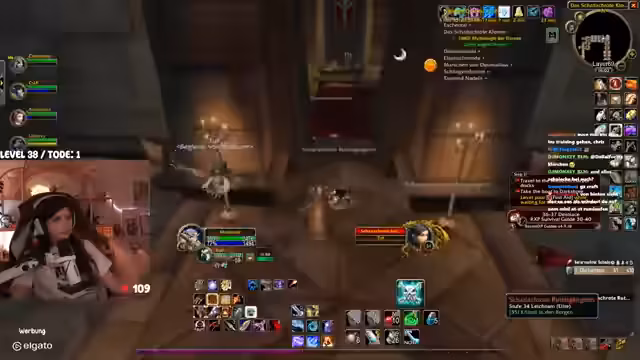 06:09:39Nach dem Sieg über den Hundemeister zieht die Gruppe weiter durch das Kloster. Es kommt zu einer gefährlichen Situation, als eine andere Gruppe den Streamer und seine Mitspieler in den Kampf gegen einen 'Fass' zieht, was zu einem Wipe fast geführt hätte. Beim weiteren Vorstoßen durch die Gänge, insbesondere im Bereich der Holzstrecken, wird die Gruppenkohäsion auf die Probe gestellt. Der Streamer und die Zuschauer diskutieren über die optimale Platzierung in den Instanzen und strategische Fehltritte, die die Gruppe in Gefahr bringen können.