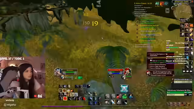 00:31:03Die Streamerin konzentriert sich darauf, Level 40 zu erreichen und optimiert ihre Route in Feralas. Sie nutzt effiziente Farm-Methoden, um schnell Erfahrungspunkte zu sammeln, und interagiert mit dem Chat über die Vor- und Nachteile ihrer Route. Dabei wird auch die Herausforderung angesprochen, in gefährlicheren Gebieten vorsichtig vorzugehen, wenn man nicht stark überlevelt ist.