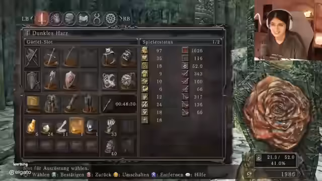 03:48:17Es wird diskutiert, welche Attribute als nächstes aufgewertet werden sollen, wobei der Fokus auf Leben liegt, da die wichtigsten Werte bereits erfüllt sind. Die bereits besiegten Bosse werden aufgezählt und die Reihenfolge für die nächsten Kämpfe festgelegt. Es wird ein Einblick in die Vorlieben für Dark Souls 3 gegeben, wobei die Trainerin ihre Abneigung gegen das Spiel und die damit verbundenen Frustrationen zum Ausdruck bringt. Die Teilnahme an Events wird als Motivation gesehen, sich Spielen zu stellen, die man sonst nicht spielen würde. Es wird die Möglichkeit eines Dark Souls 3-Koop-Spiels in Aussicht gestellt und einfache Strategien für schwierige Bosse versprochen. Nach dem Sieg über einen Boss wird eine Lanze für den Degen gebrochen, der im aktuellen Build stark ist, aber auch viele Opfer erfordert. Es folgt eine Diskussion über die Stärken und Schwächen des Degens und die Frage, ob er in zukünftigen Herausforderungen verboten werden sollte. Ein Raid von Timmy wird dankend angenommen und es wird festgestellt, dass der aktuelle Mage-Build gut funktioniert, aber kein attraktives Build für Soulkeeper ist.