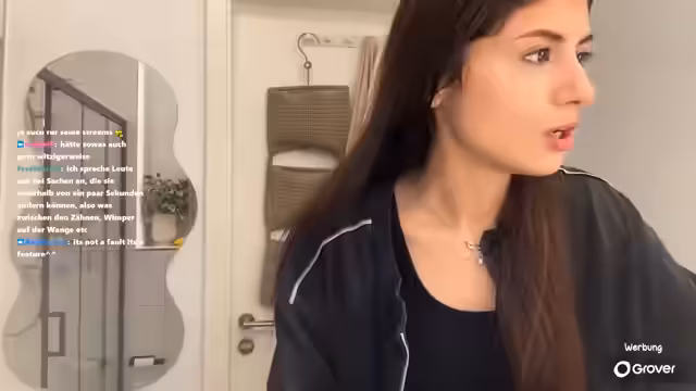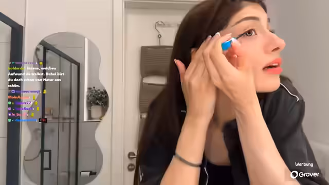 00:18:23Die Streamerin beginnt mit ihrer Beauty-Routine nach der Gesichtspflege. Sie trägt Kontaktlinsen in blau-braun-Tönen auf und diskutiert deren Handhabung. Es folgt das Auftragen von Concealer, um dunkle Augenringe zu kaschieren, und Puder für einen matten Look. Dabei spricht sie offen über Unsicherheiten und den Druck, durch Make-up anders auszusehen. Auch Augenbrauen-Gel und das Interesse an Japanischer Kosmetik werden erwähnt.