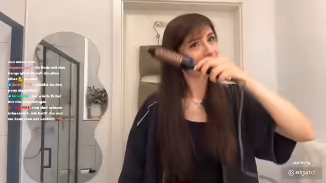 01:39:24Die Streamerin beschäftigt sich zunächst mit ihrer Frisur und erwähnt, dass sie morgen früh ihre Haare waschen wird, um eine aktuelle Veränderung rückgängig zu machen. Sie ist unsicher über ihr Aussehen, insbesondere da ihr Pony nicht zufrieden stellend ist. Dies führt zu einem inneren Konflikt und der Entscheidung, den Pony kürzer zu schneiden, um ihn besser in den Griff zu bekommen.
