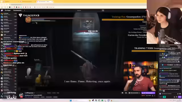 06:11:51Nach der Routenplanung beginnt das Team sofort mit der nächsten Herausforderung, dem Kampf gegen den Dancer of the Boreal Valley. Die Streamerin beschreibt den Kampf und gibt Divi kontinuierlich Tipps zur Ausweichmanöver und Angriffsmuster des Bosses. Währenddessen spricht sie über die Bedeutung ihrer Statistiken und Rüstungsausstattung und zeigt auf, wie sie ihre Stärke und Vitalität optimiert, um zukünftige Herausforderungen besser bewältigen zu können. Es wird deutlich, dass der Fokus auf ein balanciertes und starkes Charakter-Build liegt, um die steigenden Schwierigkeiten des Spiels zu meistern und potenzielle Tode durch NPCs wie Gundir zu vermeiden.