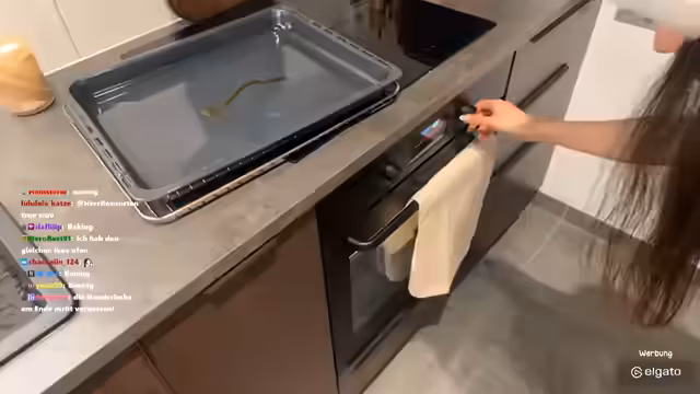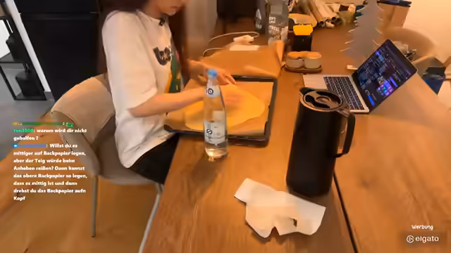 04:11:11Während einer Spielunterbrechung kümmert sich der Streamer um den Plätzchenteig: Er wird für mindestens eine Stunde im Kühlschrank gelagert, während parallel World of Warcraft gespielt wird. Beim Backen fehlt ein Nudelholz – stattdessen wird improvisiert (Flasche als Ersatz). Der Airfryer wird als Backalternative diskutiert, aber traditionelles Backen bei 160-170°C Umluft bevorzugt. Die Geräuschkulisse des Spiels wird als „satisfying“ beschrieben, während das Ausrollen des Teigs auf Backpapier ohne Mehl erklärt wird. Ein Zeitmanagement-Plan (20 Minuten Pause) wird kommuniziert.