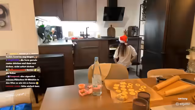 04:52:42Die Plätzchen-Backsession wird im Esstisch-Bereich fortgesetzt, da mehr Platz vorhanden ist. Technische Schwierigkeiten: Der Chat aktualisiert nicht, was zu Wiederholungsfragen führt. Als „Löwenzahn-Intro in Techno“ beschrieben, während der Streamer den Airfryer testet. Ofen-Details werden geklärt (160°C Umluft), aber der Airfryer wird bevorzugt. Die Geräuschkulisse wird kommentiert, während der Teig zwischen Backpapier ausgerollt wird. Ein improvisiertes Nudelholz (Flasche) wird verwendet, da das Original fehlt. Der Streamer betont den seltenen Gebrauch des Backofens zugunsten des Airfryers.
