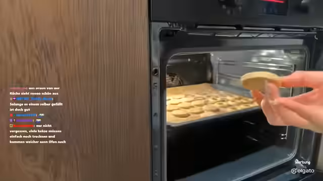 05:21:40Die Kekse werden bei 165°C Umluft gebacken. Anfänglich sind sie nach 10 Minuten noch zu weich, sodass die Backzeit verlängert wird. Die Streamerin beobachtet den Garfortschritt kritisch und passt die Position im Ofen an. Es entsteht eine Diskussion über die optimale Backzeit, bei der auch die Magenverträglichkeit hellerer Kekse thematisiert wird.