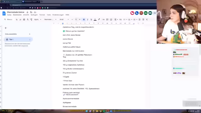 00:52:14Der Streamer kündigt an, dass nach dem Kochen Plätzchen gebacken werden, wobei der Fokus auf gastritisfreundlichen Rezepten liegt, da seine Mutter an Gastritis leidet. Er beschreibt die Idee, Marmeladenplätzchen mit möglichst wenig Zucker und Fett zu backen, und überlegt, wie der Teig am besten zubereitet werden kann. Es geht um die liebevolle Geste, die Plätzchen mit nach Hause zu nehmen, und die experimentelle Herangehensweise, da er selten backt.