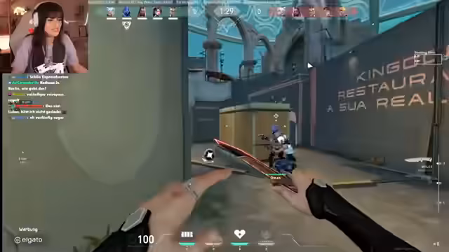 01:39:25Gegen 20 Uhr wechselt der Stream zum Spiel Valorant. Die Streamerin spielt mehrere Runden, indem sie sich auf den Operator Chamber konzentriert und für Teammates Callouts macht. Das Gameplay ist von hitzigem Kampfgeschehen und gelegentlichem Frust geprägt, als sie Gegner verfehlt oder das Team knapp verliert. Sie erwähnt ihre Konzentrationsschwierigkeiten und dass sie sich wegen der bevorstehenden Reise müde fühlt. Auch die Anschaffung neuer Skins und Waffen wird thematisiert.