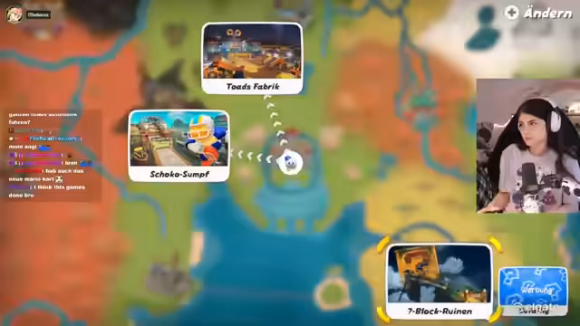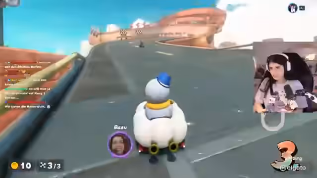 03:57:46Nach erfolgreichem Start des Mario Kart-Rennens tauchen die ersten Momente der Freude und des Chaos auf. Die Streamerin entdeckt die Gesichtskamera-Funktion, die es ermöglicht, die Reaktionen der anderen Spieler live zu sehen und findet dies sehr unterhaltsam. Es kommt zu lustigen Situationen, bei denen sich die Fahrer gegenseitig blockieren oder Items wie den Stern einsetzen. Die Dynamik des Rennens, zwischen Erfolg und Führung, wird mit viel Enthusiasmus kommentiert und die Stimmung ist geprägt von Spaß und einem lockeren Umgang miteinander.