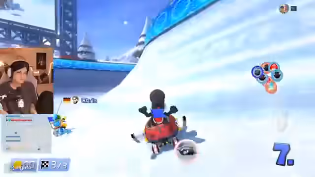 03:03:30Nach den Teamrennen auf 150 CC wechseln die Teilnehmer zu 200 CC und spielen solo. Es wird über die Wahl der Karts gesprochen, wobei der Streamer den Pünktchen-Kart als "Easy-Mode" empfiehlt. Die Rennen werden als chaotisch und zufällig beschrieben, wobei Items wie blaue Panzer und Raketen das Rennen dominieren und für viel Frust sorgen.