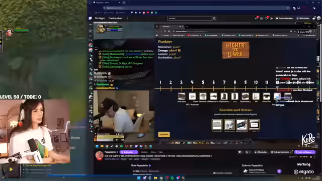 03:13:18Ein Quiz-Event von Papa Platter steht an, während die Gruppe weiter questen möchte. Der Streamer plant, das Quiz nebenbei im Stream anzuhören. Es gibt organisatorische Hürden, wie die Anmeldung über einen Discord-Link und die Abschätzung der Teilnahmezeit. Die Zuschauer werden aufgefordert, sich im Event-Channel einzutragen, und es gibt eine Koordination mit dem Streamer Robin, um das Event zu restreamen. Dieses Quiz ist ein "Higher or Lower"-Spiel, bei dem es um das Erraten von Gewichten oder Popularität von Gegenständen geht.