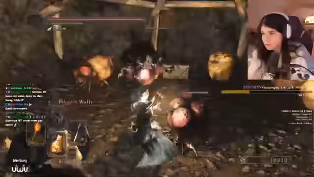 02:59:36Nach dem Erkundungsteil wird der Kampf gegen den Boss Rotten aufgenommen. Hierbei wird eine Strategie entwickelt, die das Auswechseln der Waffen auf Feuerpfeile beinhaltet. Ein zufälliger Invader erscheint im Kampf, was die Situation unerwartet und chaotisch gestaltet. Der Invader stirbt schließlich durch einen eigenen Fehler, nachdem er emotet hat, was als 'Karma' im Chat kommentiert wird.