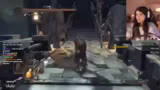 01:59:32Im Eisenschloss stellt der Streamer fest, dass er keine Lebenssteine mehr hat. Er versucht, seine Waffen zu verstärken, wird aber durch auftretende Invasions und feindliche Bogenschützen stark beansprucht. Nachdem er eine Save-File erstellt hat, kämpft er sich weiter durch die Festung und muss dabei viele Gegner auf engen Plattformen bekämpfen. Der Höhepunkt ist der Kampf gegen den Smelter Demon, einen Bosskämpfer, den der Streamer nach anfänglichen Schwierigkeiten mit der richtigen Taktik, dem Blockieren seiner Angriffe, besiegt.