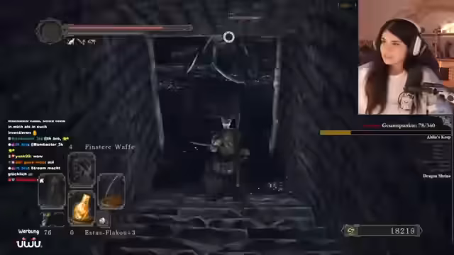02:40:23Der Stream beginnt mit der Erkundung eines neuen Gebiets namens 'Loch'. Es wird eine Fackel gebaut, um sich zu orientieren, und der Chat wird nach Hinweisen gefragt. Nach der Entzündung der Fackel geht es tiefer in das Gebiet, wo mehrere Gegner bekämpft werden. Die Konzentration liegt auf der Vorbereitung für den anstehenden Bosskampf und dem Sammeln von Seelen.