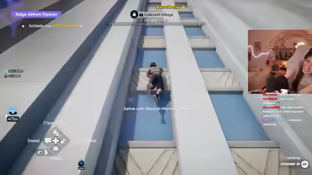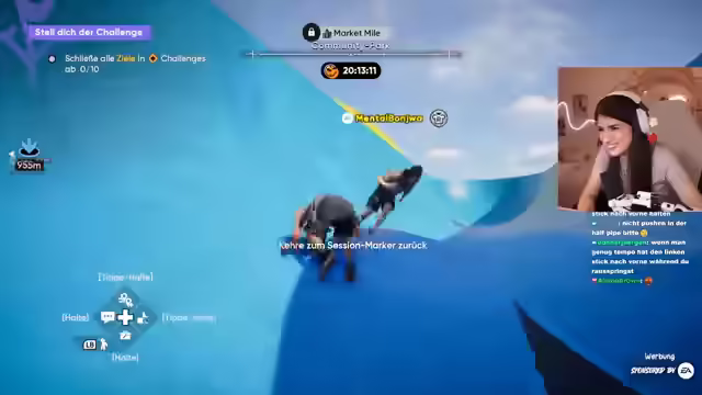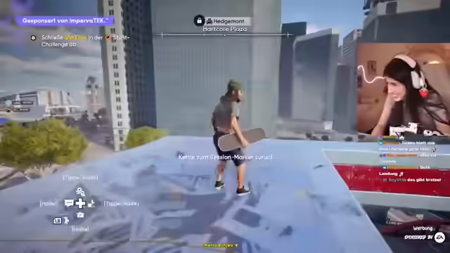 03:06:27Nachdem eine Herausforderung erfolgreich abgeschlossen wurde, bei der Manual Distance und Wheelies gefordert waren, wird über die Anzahl der Punkte auf der Map diskutiert und entschieden, zur Kunstgalerie zu gehen. Dort angekommen, wird ein Stunt am Rand entdeckt und Matthias wird gute Besserung gewünscht. Es wird überlegt, welcher Marker der richtige ist, und schließlich der lila Marker gewählt. Nach einigen Versuchen und gegenseitiger Unterstützung wird ein Sprung in den Müll erfolgreich absolviert, gefolgt von der Entdeckung, dass man im Spiel fliegen kann. Eine von Impervatec gesponserte Einstiegs-Stunt-Challenge wird angekündigt. Es wird betont, dass man im Spiel alles ausprobieren kann, ohne reale Konsequenzen fürchten zu müssen. Eine neue Challenge, 'Wage den Sprung', wird gestartet, bei der man in einen Kanal tauchen und zwischen Bogenpfeilern hindurchfliegen muss. Nach mehreren Versuchen wird die Challenge mehr oder weniger erfolgreich abgeschlossen.