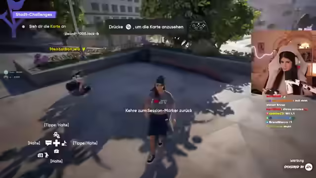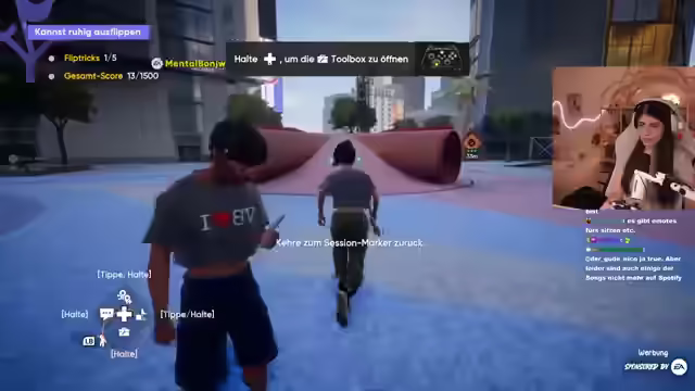 02:39:40Die Session beginnt mit der Entdeckung, dass man Rampen mitten auf der Straße platzieren kann, was neue Möglichkeiten für Skateparks eröffnet. Durch Tippen auf das Steuerkreuz kann man Savepoints setzen und Rampen erstellen. Es wird eine Brücke gesucht, die als gelbes 'Apac' markiert ist, um dort im Koop-Modus zu starten. Ziel ist es, über Gaps zu springen, was sich jedoch als schwierig erweist, da die Charaktere nicht schnell genug beschleunigen. Nach einigen Versuchen wird festgestellt, dass man X drücken muss, um Flip-Tricks auszuführen und den Olli länger drücken muss, um die Beine anzuziehen. Es wird an Gesamtscore und Grinds gearbeitet, um eine Challenge abzuschließen. Am Ende schaffen sie es als Team, die Challenge zu meistern, und stellen fest, dass sie gemeinsam gewertet werden. Eine neue Challenge ab 5 von 10 wird gestartet, wobei nicht alle Ziele abgeschlossen werden müssen, um Belohnungen zu erhalten. Es wird festgestellt, dass der Charakter stirbt, sobald er das Wasser berührt, selbst nach schweren Stürzen.