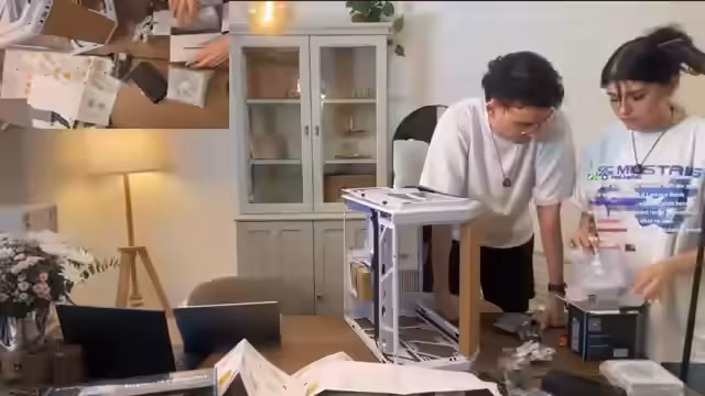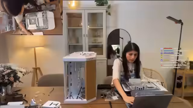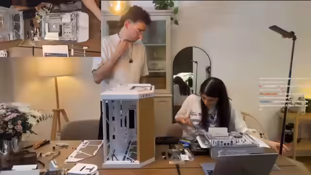 00:40:41Der Einbau der CPU und des Mainboards beginnt. Die Streamer folgen der Anleitung, stellen aber fest, dass gewisse Anpassungen nötig sind. Die CPU wird mit Dreieck-auf-Dreieck-Ausrichtung installiert, wobei Spannung besteht. Der Lüfter wird direkt danach montiert, jedoch mit Platzierungsproblemen aufgrund des Gehäusedesigns.