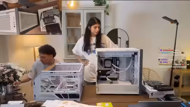 00:24:14Das Gehäuse, ein iBuyPower Hyte Y70 Touch Infinite Modern Aesthetic, wird ausgepackt. Die Verpackung wird als umständlich beschrieben. Die Streamer entfernen Glaspaneele und bereiten das Gehäuse auf den Einbau der Komponenten vor. Dabei kommt es zu Herausforderungen bei der Handhabung der empfindlichen Teile und der Folienentfernung.