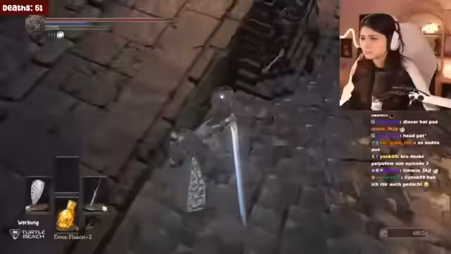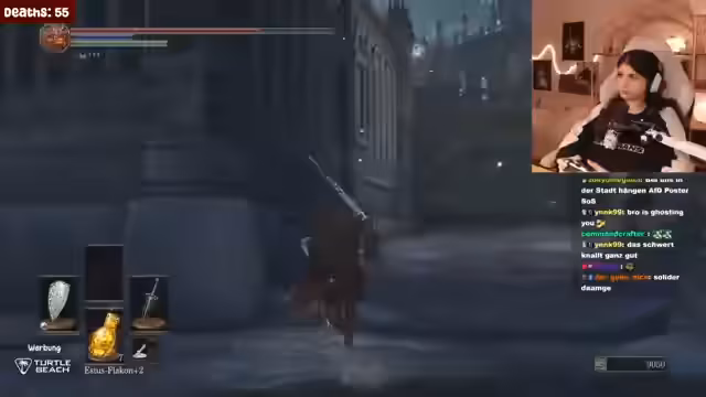 00:19:18Der Streamer erreicht den Boss Pontiff Sulyvahn. Während des ersten Kampfes wird er schnell besiegt und analysiert anschließend, dass seine Waffe zu langsam war. Er kauft in der Stadt einen "magischen Ball", um mit ihm in die zweite Phase des Bosskampfs zu gelangen. Mit dieser Strategie gelingt es ihm, Sulyvahn zu besiegen und eine Seelenmenge zu sammeln.
