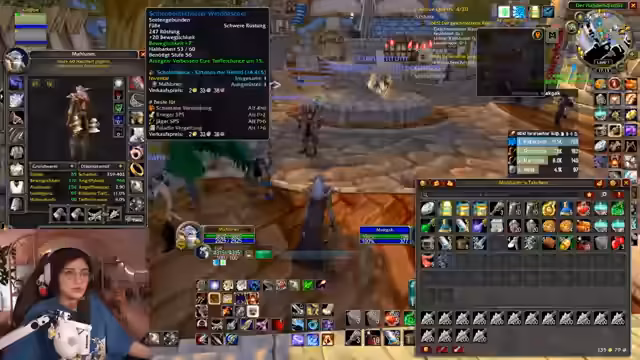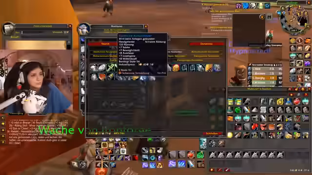 07:12:14Die Streamerin bereitet ihre Ausrüstung und Verzauberungen für den Raid am nächsten Tag vor. Sie plant, ihre Äxte verzauern zu lassen, benötigt dafür jedoch noch Materialien wie Essenz der Luft und Staub von Sirenia und Suki. Ihre derzeitige Ausrüstung bringt sie auf 9% Trefferwertung, und sie möchte nach Möglichkeit auf 10% kommen, was eine weitere Verzauberung erfordert. Sie sortiert ihre Bank und fragt die Community, welche Gegenstände sie behalten oder wegwerfen soll.