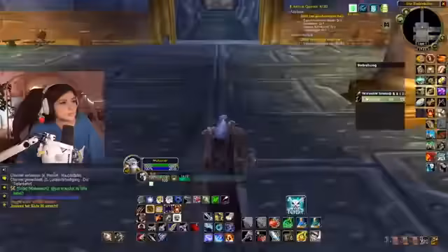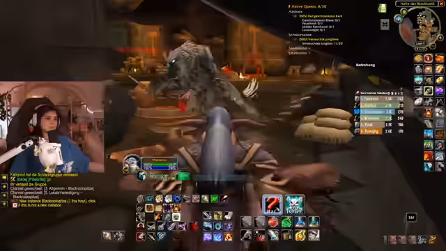 07:09:54Es tauchen technische Probleme auf. Die Streamerin hat einen Visual Bug mit ihrer Katzenform und kann die Quest nicht richtig abschließen. Zudem hat sie ein Problem mit ihrem Mikrofon, das sie nicht richtig eingestellt hat, weshalb man Tasten und Hintergrundgeräusche im Stream hört. Sie bietet Gucci Hilfe für dessen private Session an. Bevor sie wieder in den Chat zurückkehrt, muss sie noch kurz Dinge für den Raid vorbereiten und werden von Mitgliedern der Community aktiv unterstützt.