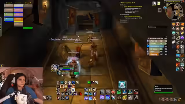 07:45:25Nach dem ersten Boss-Kämpft das Team weiter durch die Instanz. Währenddessen wird das Inventar aufgeräumt und verteilt. Gegenstände, die nicht mehr benötigt werden, werden an Mats geschickt. Für andere Gegenstände wie Dunkel Eisen Fragmente wird gefragt, wer sie benötigt. Die Streamerin überlegt, ob sie bestimmte Verzauberungen für den Raid benötigt und wie sie ihre Ausrüstung optimieren kann.