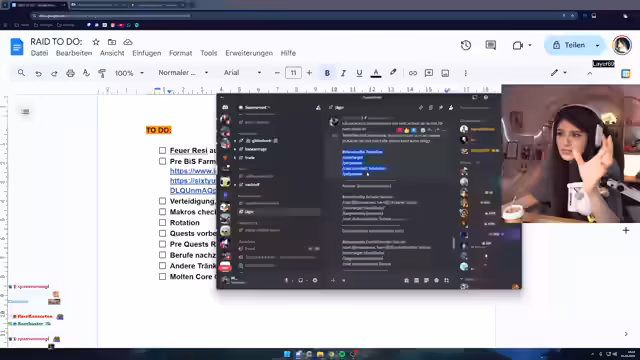 00:16:01Die Streamerin präsentiert eine kleine, überschaubare To-Do-Liste für die bevorstehenden Raid-Aktivitäten. Ein zentrales Thema ist die Notwendigkeit von Feuerresistenz für den Raid 'Molten Core', wobei sie noch unsicher ist, wie dies konkret umzusetzen ist – durch Rüstung-Enchants oder durch Tränke. Sie erwähnt zudem die Chase-the-Line-Lagged-Quest, einen von einem Viewer erhaltenen Link für eine Liste mit Vorbereitungsaufgaben, und gibt an, ihre Verteidigungswerte seien fast auf dem Maximum.