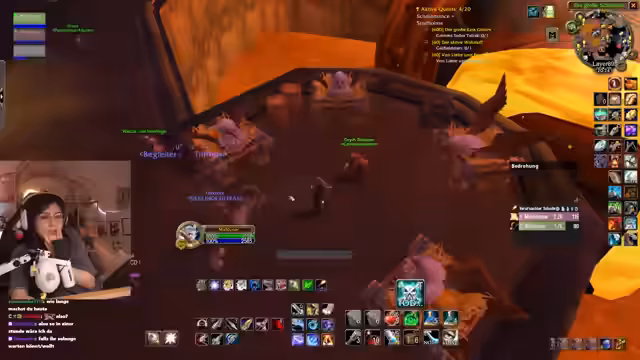04:18:24Eine komplexe Quest in der 'Festung' wird unternommen. Ziel ist es, Diener zu einem Kristall zu locken, auf 1% Leben zu reduzieren und diesen dann zu nutzen. Die Anwesenheit von Elites und ein aggroüberschreitender Boss ('Grolloc') erfordert große Vorsicht. Die Gruppe ist sich unklar über die genauen Mechaniken und den Weg zum Ziel. Nachdem der Kristall aktiviert wurde, taucht der Boss auf und der Streamer erinnert sich an eine frühere, panische Erfahrung mit diesem Boss.