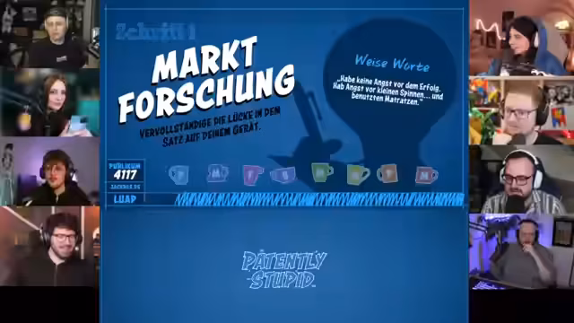 01:47:36Es wird ein neues Spiel namens 'Patently Stupid' gestartet, bei dem die Teilnehmer Probleme erfinden und Lösungen dafür entwickeln müssen. Es wird erklärt, dass jeder ein Problem erfindet, das dann von einem anderen Teilnehmer gelöst werden muss. Dieser muss eine Erfindung zeichnen, ihr einen Namen geben und einen Slogan entwickeln. Die Erfindung wird dann wie in einer PowerPoint-Präsentation vorgestellt. Es wird befürchtet, dass das Spiel zu wütenden Tweets führen könnte. Ein anderes Spiel wird erwähnt, bei dem es darum geht, nette Kommentare über Frauen zu schreiben, die dann von anderen Teilnehmern verändert werden können, um sie ins Lächerliche zu ziehen. Es wird befürchtet, dass dieses Spiel ausarten könnte. Es wird darauf geachtet, dass niemand streamt, der nicht volljährig ist, um sicherzustellen, dass das Spiel familienfreundlich bleibt.