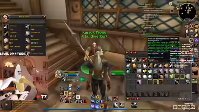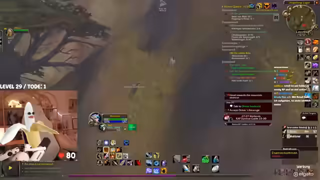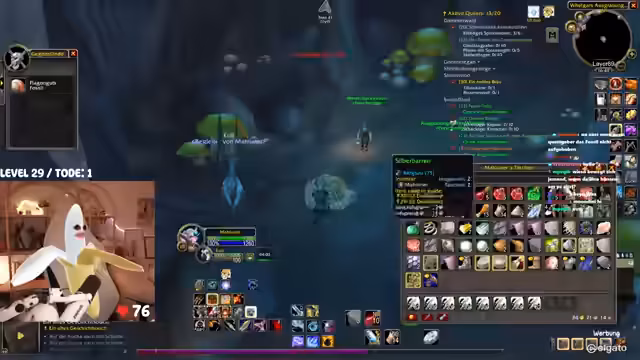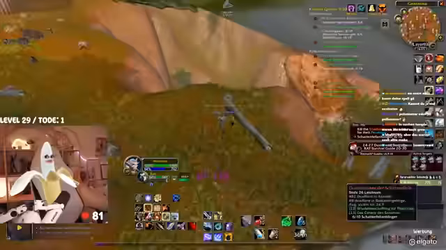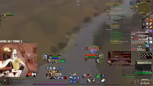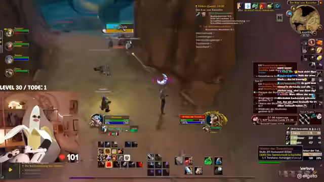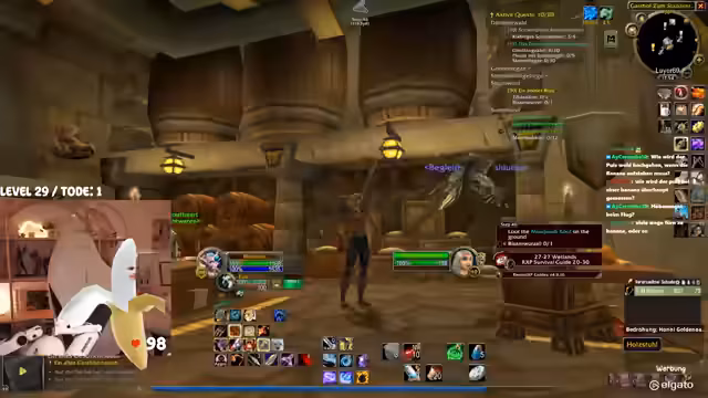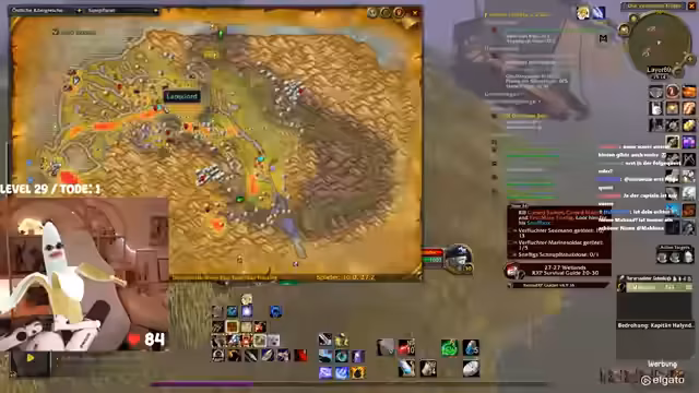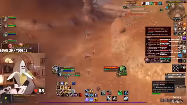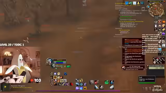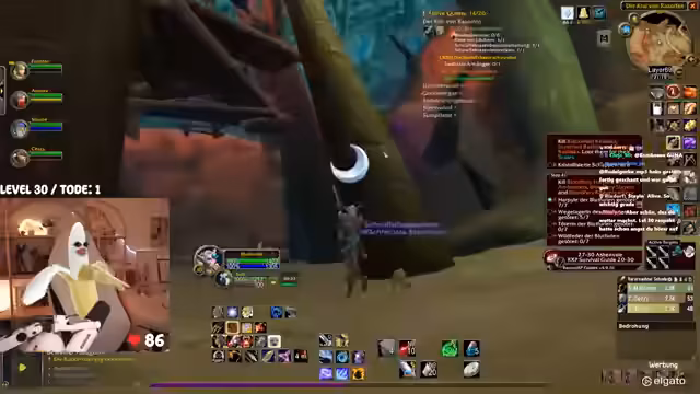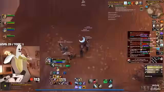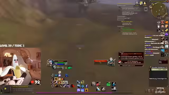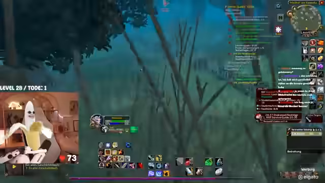 00:42:25Das Gameplay wird von den typischen Herausforderungen eines WoW-Hardcore-Streams geprägt. Die Streamerin kämpft mit dem Interface, das sie als überfordernd beschreibt. Bei der Jagd nach dem Elite-Mob 'Mauladim' kommt es zu einem gefährlichen Fettpull, der aber auf grauen Mobs glimpflich ausgeht. Sie diskutiert die Nutzung von 'Todstellen', einer Fähigkeit, die sie zwar als angenehm empfindet, aber auch als risikobehaftet ansieht. Ein unglücklicher Vorfall mit einem anderen Spieler auf dem Schiff führt dazu, dass beide sterben, was zu einer etwas chaotischen und hektischen Situation führt.
