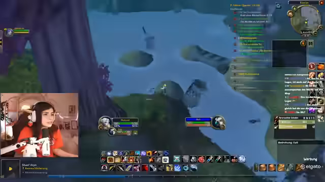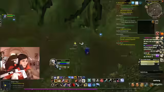 09:02:09Der Stream kehrt zum ursprünglichen Gameplay zurück, dem Questen in der Zone Eschenthal. Der Streamer und sein Team konzentrieren sich auf das Sammeln von Questobjekten und das Töten von Elitemobs. Dabei nutzen sie spezielle Fähigkeiten wie 'Verborgenes aufspülen', um unsichtbare Gegner aufzuspüren und effizienter zu farmen.