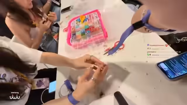 02:45:11Zum Abschluss des Streams besuchen die Streamerinnen einen Workshop, um eine "Clear Elastic"-Armbänder zu erstellen. Eine Mitarbeiterin zeigt ihnen schrittweise den Prozess des Knotens und des Befestigens. Die Anleitung wird dankbar entgegengenommen und sie beginnen, die Armbänder selbst zu fertigen. Dieser kreative Abschluss bietet eine ruhige und interaktive Phase, bei der sie sich auf eine manuelle Tätigkeit konzentrieren und ihre Aufmerksamkeit von der Messe abwenden.