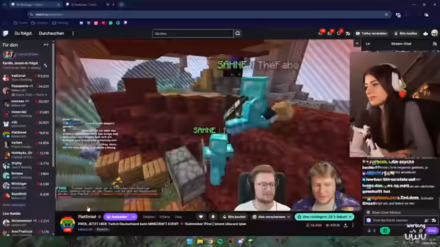 00:25:23Es wird angekündigt, dass Bloodborne auf der Konsole gespielt wird, da das Spiel bereit ist. Später, um 18:45 Uhr, soll ein Minecraft-Server betreten werden, um am Format "Minecraft Pyrol" von Pete's Meet teilzunehmen, einem Battle Royale-ähnlichen Event. Das Event startet offiziell um 19 Uhr und könnte schnell vorbei sein oder mehrere Stunden dauern. Die Streamerin und Lukas haben sich vorgenommen, im Spiel pazifistisch vorzugehen und Konfrontationen zu vermeiden. Es wird kurz über ein Apple Event und das neue iPhone spekuliert. Ein Clip von Nick Beats Twitch wird gezeigt, der für Erheiterung sorgt. Die Streamerin betont, dass ein Kuss im Clip sehr intensiv sei und scherzt über mögliche zukünftige Challenges. Vor dem Start von Bloodborne sollen noch ein oder zwei kurze Videos angeschaut werden.
