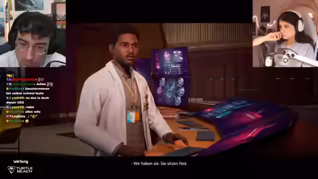 02:47:36Die beiden Spieler erreichen das Finale von 'Split-Fiction', ein Ausbruch-Szenario, bei dem sie aus einem Raumschiff fliehen müssen. Die Dynamik zwischen den beiden Figuren wird als menschlich und emotional beschrieben. Das Spiel endet mit dem Verlassen des Schiffs und einer aufkeimenden Romanze zwischen den Charakteren, was den Streamer dazu veranlasst, eine persönliche Note einzufügen und sich für die Geschichte zu bedanken.